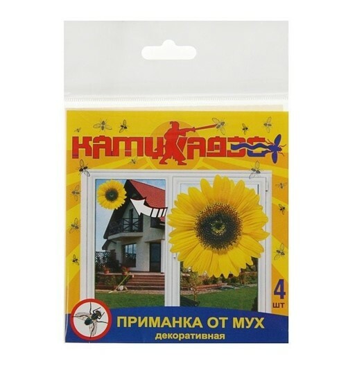 и мушиный феромон трикозен. Картинка приклеивается самоклеящейся стороной к любой поверхности частой посадки мух